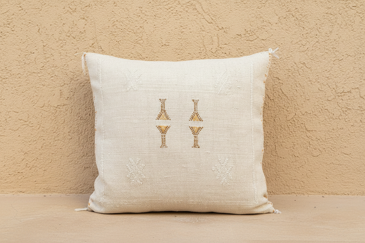 Voeg een bohemien tintje toe aan je interieur met onze handgeweven cactus zijde kussen slopen, gemaakt door ambachtslieden in Marokko. Elke kussensloop is een uniek kunstwerk en is voorzien van borduurwerk en verkrijgbaar in verschillende kleuren en patronen. Deze simpele en abstracte patronen vormen symbolische motieven in Berbers.