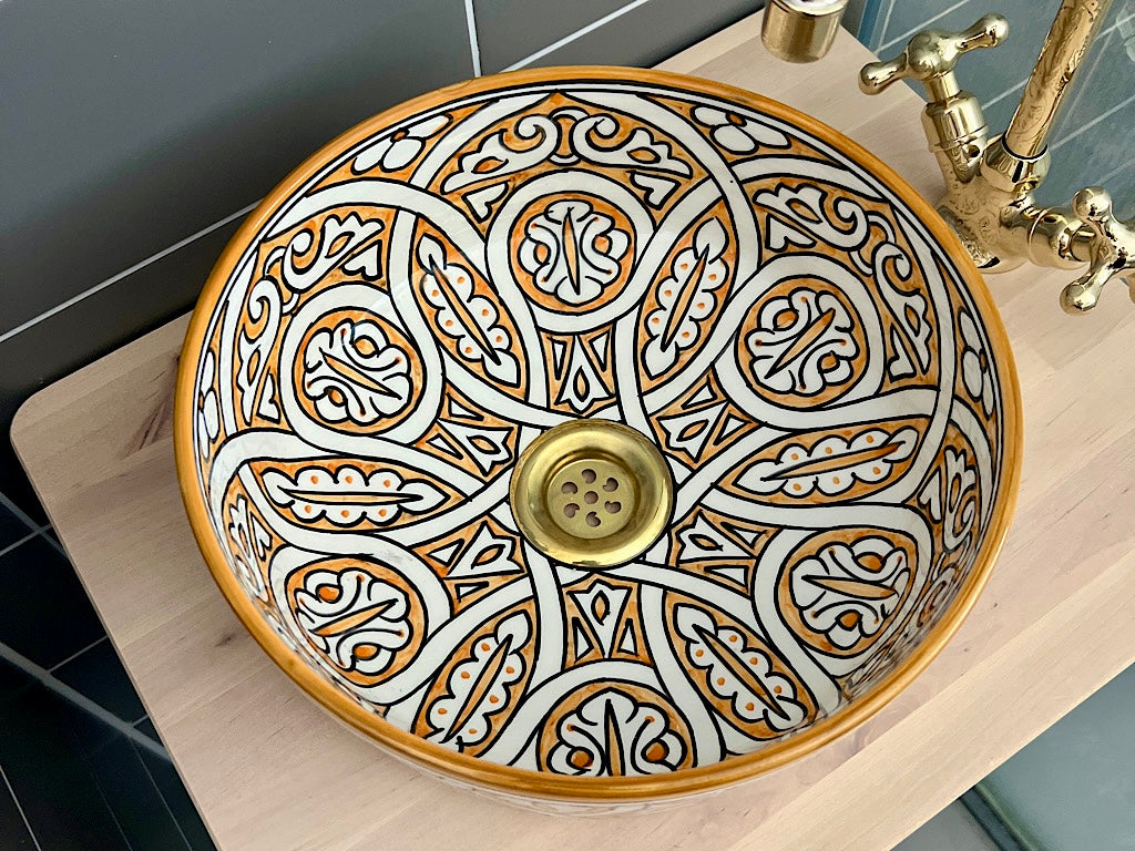 Deze prachtige Marokkaanse wasbak, met de hand vervaardigd en beschilderd door lokale ambachtslieden in Marokko, straalt luxe uit met zijn witte keramische materiaal. De aardewerken Marokkaanse waskom is verfijnd beschilderd aan zowel de binnen- als buitenkant en hoort elegant geplaatst te worden op een blad. Het unieke ambachtelijke proces kan leiden tot kleine onregelmatigheden en imperfecties, die echter niet als gebreken worden beschouwd, maar eerder bijdragen aan de charme en uniciteit van het product.