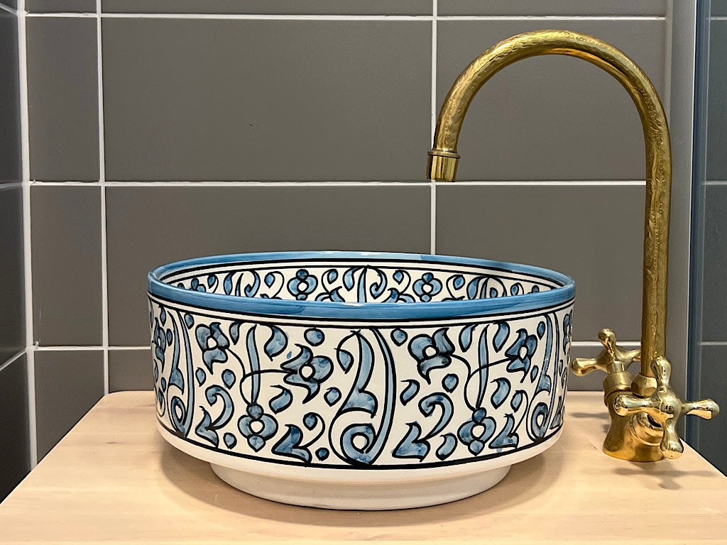 Deze prachtige Marokkaanse wasbak, met de hand vervaardigd en beschilderd door lokale ambachtslieden in Marokko, straalt luxe uit met zijn witte keramische materiaal. De aardewerken Marokkaanse waskom is verfijnd beschilderd aan zowel de binnen- als buitenkant en hoort elegant geplaatst te worden op een blad. Het unieke ambachtelijke proces kan leiden tot kleine onregelmatigheden en imperfecties, die echter niet als gebreken worden beschouwd, maar eerder bijdragen aan de charme en uniciteit van het product.