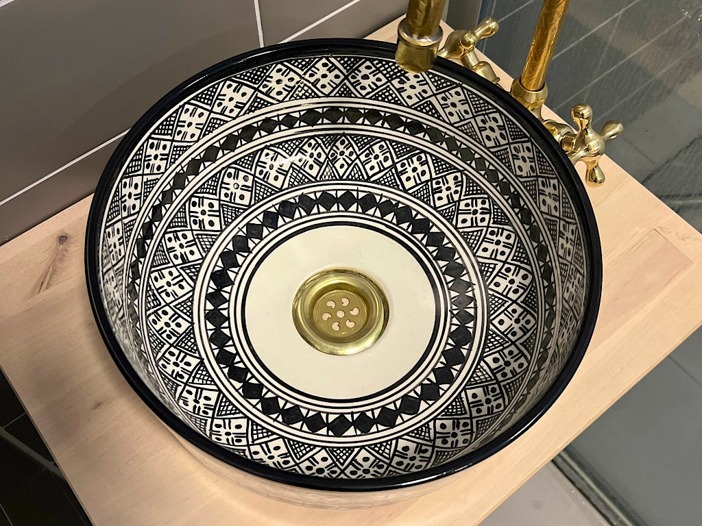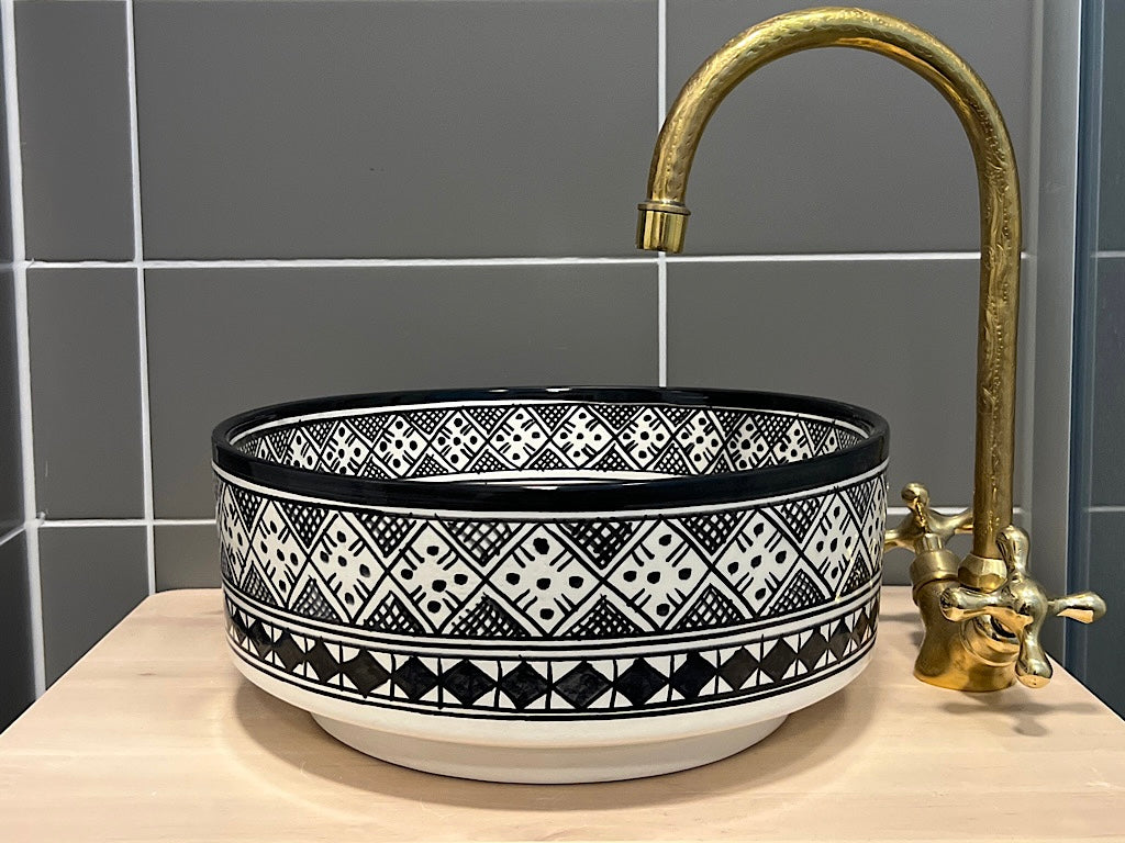 Deze prachtige Marokkaanse wasbak, met de hand vervaardigd en beschilderd door lokale ambachtslieden in Marokko, straalt luxe uit met zijn witte keramische materiaal. De aardewerken Marokkaanse waskom is verfijnd beschilderd aan zowel de binnen- als buitenkant en hoort elegant geplaatst te worden op een blad. Het unieke ambachtelijke proces kan leiden tot kleine onregelmatigheden en imperfecties, die echter niet als gebreken worden beschouwd, maar eerder bijdragen aan de charme en uniciteit van het product.