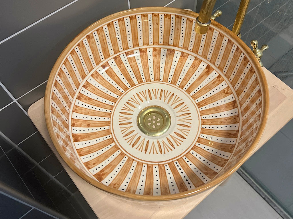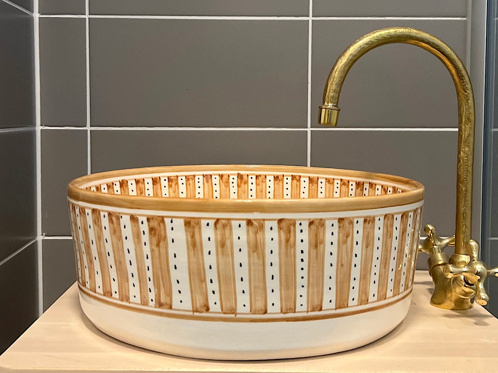Deze prachtige handgemaakte Marokkaanse waskom, met de hand vervaardigd en beschilderd door lokale ambachtslieden in Marokko, straalt luxe uit met zijn witte keramische materiaal. De aardewerken waskom is verfijnd beschilderd aan zowel de binnen- als buitenkant en hoort elegant geplaatst te worden op een blad. Het unieke ambachtelijke proces kan leiden tot kleine onregelmatigheden en imperfecties, die echter niet als gebreken worden beschouwd, maar eerder bijdragen aan de charme en uniciteit van het product. De luxe versie van deze wasbak is voorzien van een strak design, prachtig afgewerkt met een laagje glans, wat een extra vleugje verfijning toevoegt aan elk interieur.