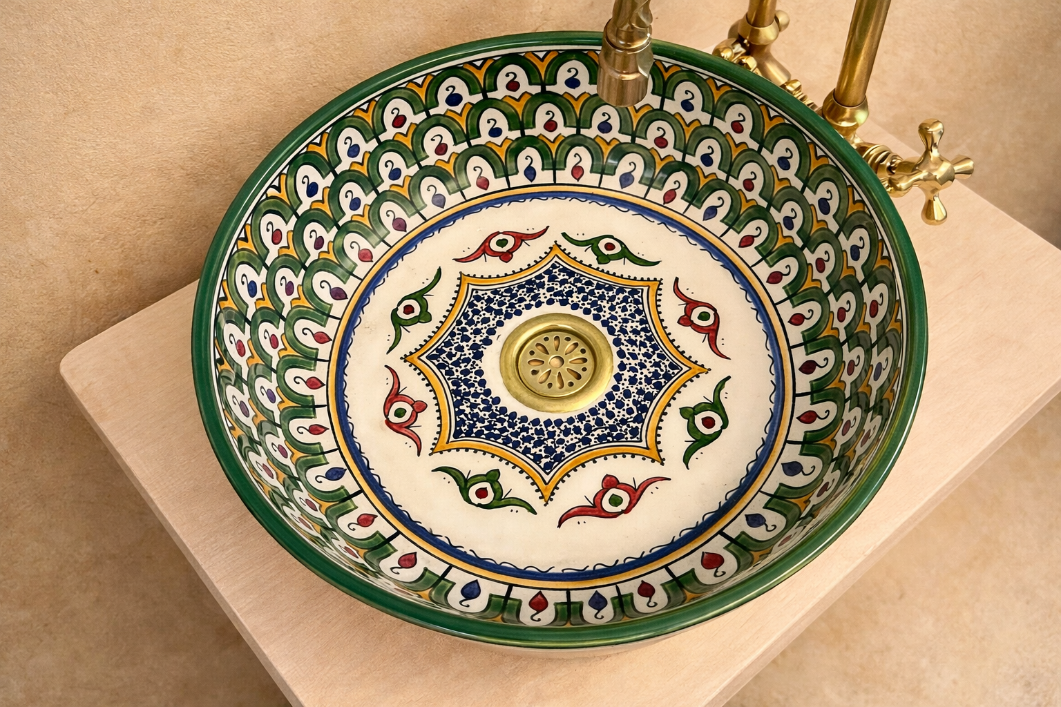 Omdat deze Marokkaanse waskom volledig met de hand wordt gemaakt, kunnen kleine variaties in kleur, patroon of vorm voorkomen. Dit zijn geen fouten, maar juist het bewijs van echt ambacht en maken elke waskom uniek.