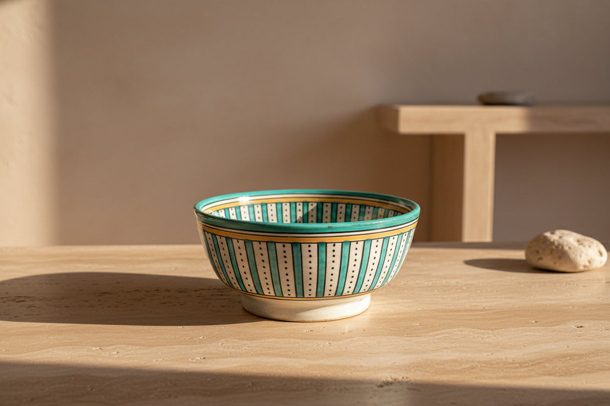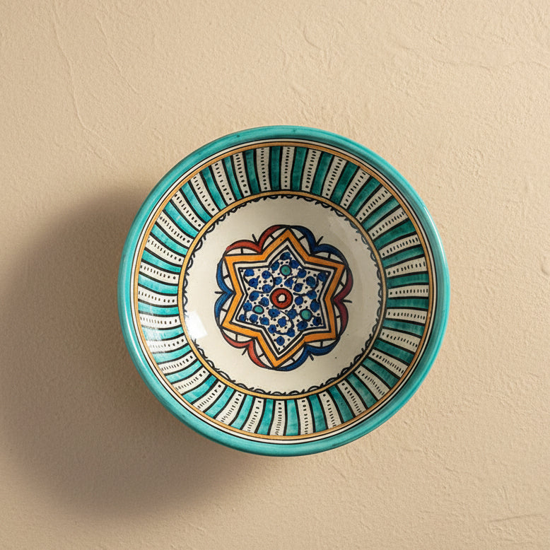 Breng een vleugje Marokkaanse elegantie naar je tafel met deze handgemaakte Marokkaanse saladeschaal. Perfect voor het serveren van verse salades, warme gerechten zoals rijst, of snacks zoals chips en popcorn, biedt deze diepe schaal veelzijdigheid die elke maaltijd of samenkomst bijzonder maakt.