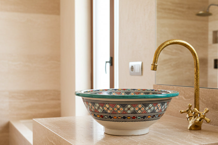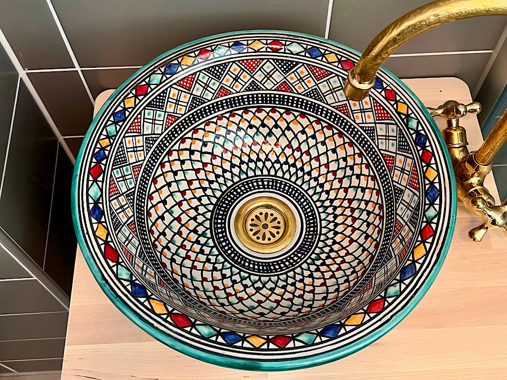 Onze betoverende Marokkaanse wasbak is een prachtige showcase van traditioneel ambachtelijk vakmanschap. Elk stuk wordt met de hand gevormd en zorgvuldig beschilderd door deskundige ambachtslieden uit Marokko, waarbij eeuwenoude technieken worden gebruikt om een opvallend en functioneel kunstwerk te creëren.