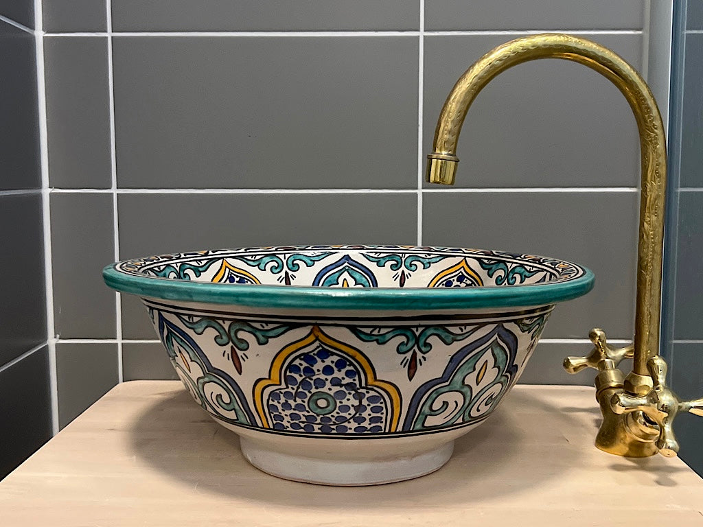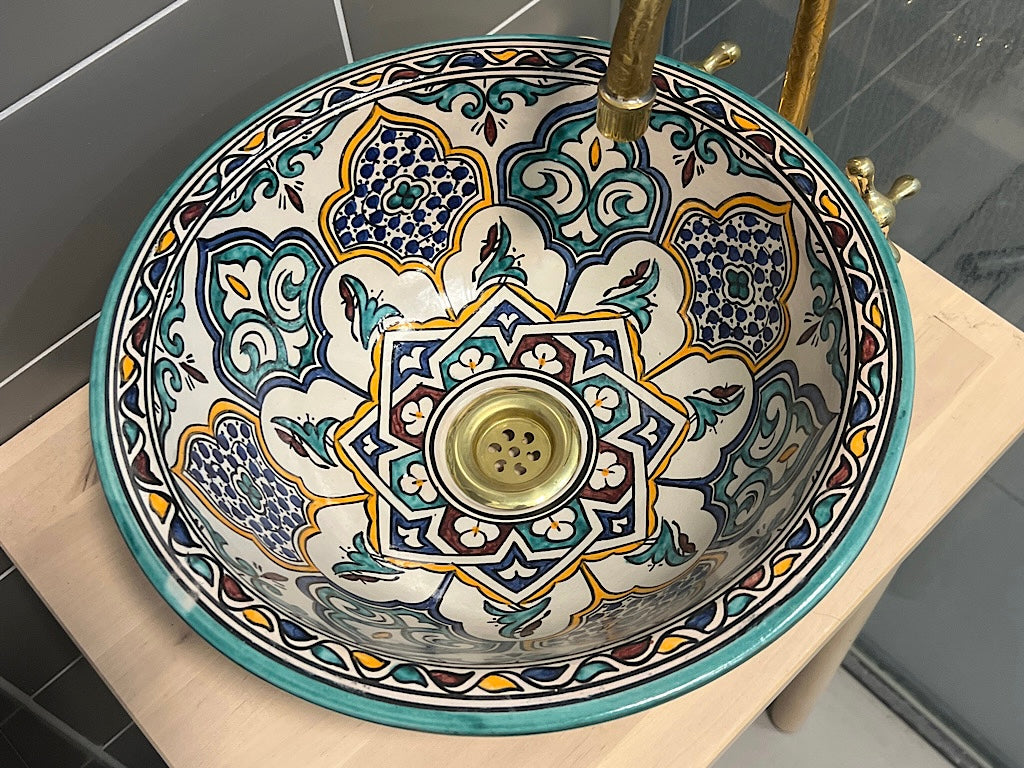 Onze betoverende Marokkaanse waskom is een prachtige showcase van traditioneel ambachtelijk vakmanschap. Elk stuk wordt met de hand gevormd en zorgvuldig beschilderd door deskundige ambachtslieden uit Marokko, waarbij eeuwenoude technieken worden gebruikt om een opvallend en functioneel kunstwerk te creëren.