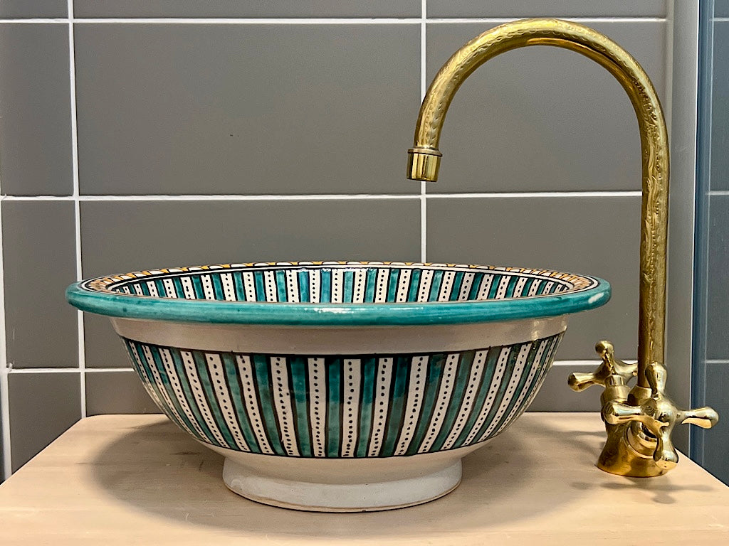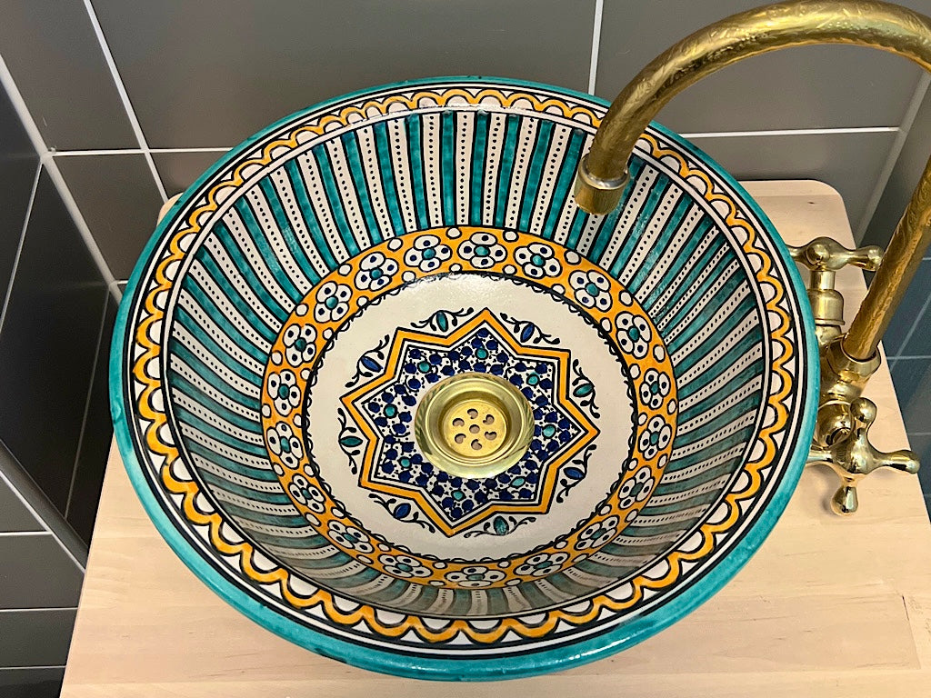 Onze betoverende Marokkaanse wasbak is een prachtige showcase van traditioneel ambachtelijk vakmanschap. Elk stuk wordt met de hand gevormd en zorgvuldig beschilderd door deskundige ambachtslieden uit Marokko, waarbij eeuwenoude technieken worden gebruikt om een opvallend en functioneel kunstwerk te creëren.
