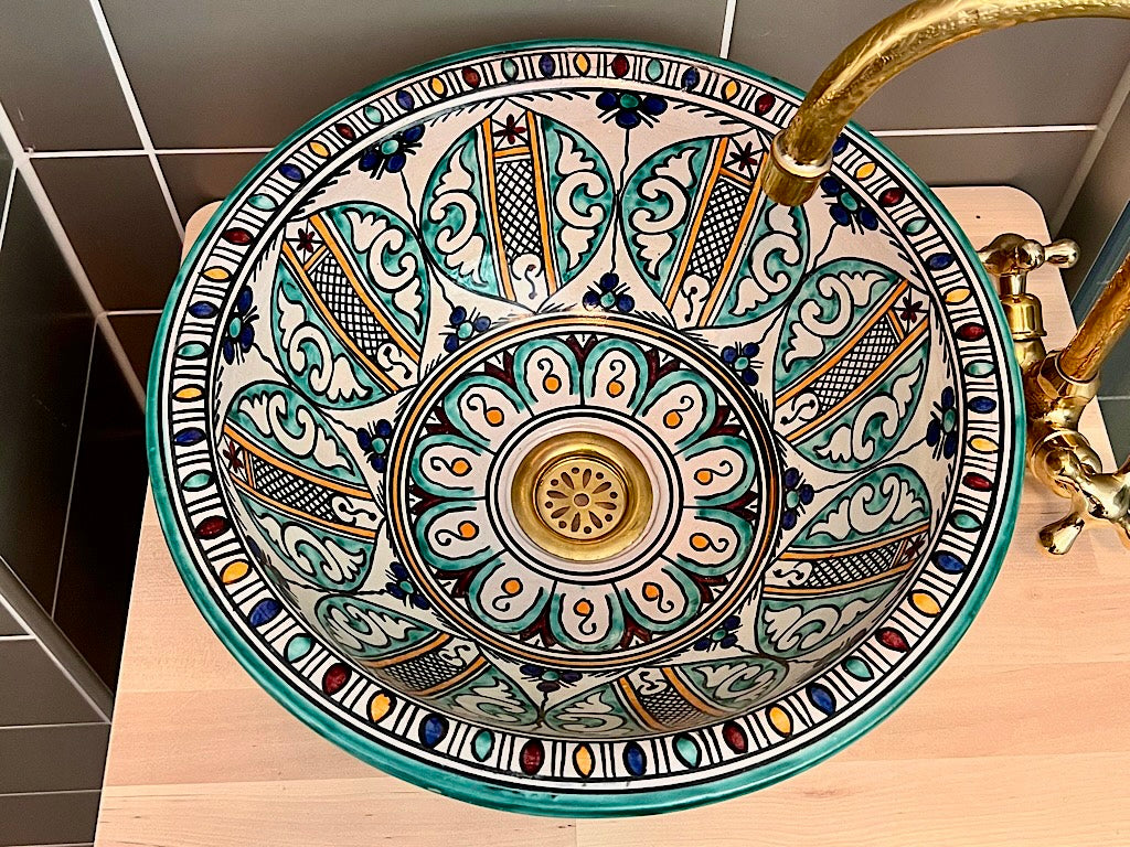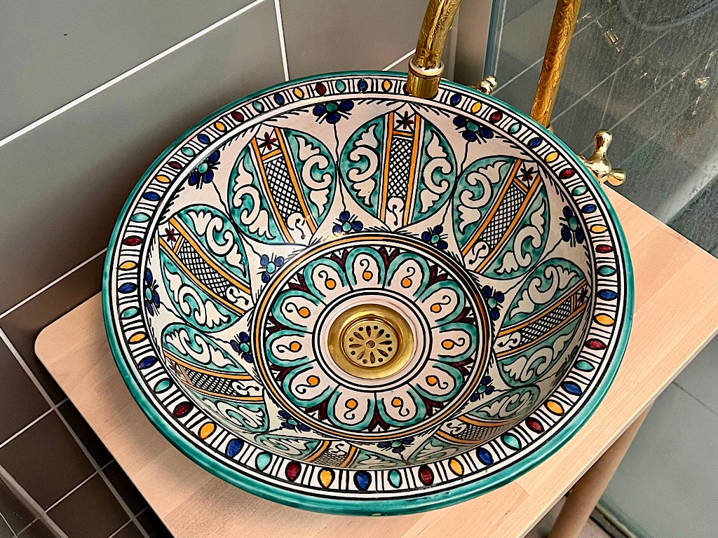 Onze betoverende Marokkaanse wasbak is een prachtige showcase van traditioneel ambachtelijk vakmanschap. Elk stuk wordt met de hand gevormd en zorgvuldig beschilderd door deskundige ambachtslieden uit Marokko, waarbij eeuwenoude technieken worden gebruikt om een opvallend en functioneel kunstwerk te creëren.