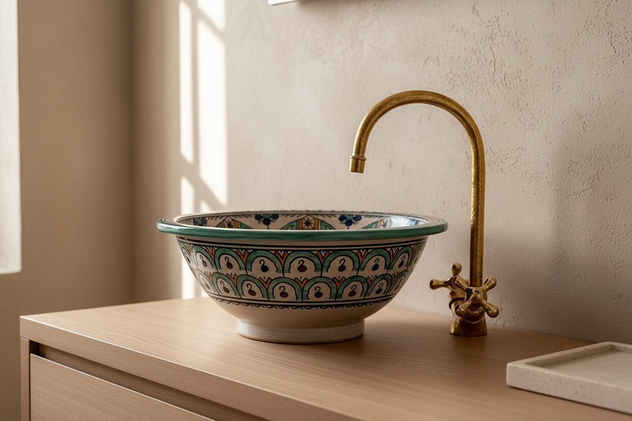 Met onze handgemaakte Marokkaanse wasbak in uw badkamer, slaapkamer, buitenkeuken of in de tuin geniet u niet alleen van een functioneel item, maar ook van een stukje levende geschiedenis en cultuur. Haal vandaag nog deze unieke combinatie van schoonheid, functionaliteit en traditioneel vakmanschap in huis. Elk stuk is uniek, en daarmee ook uw ervaring.