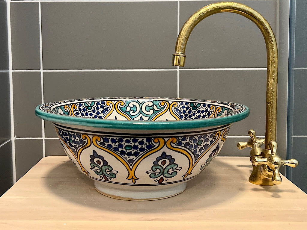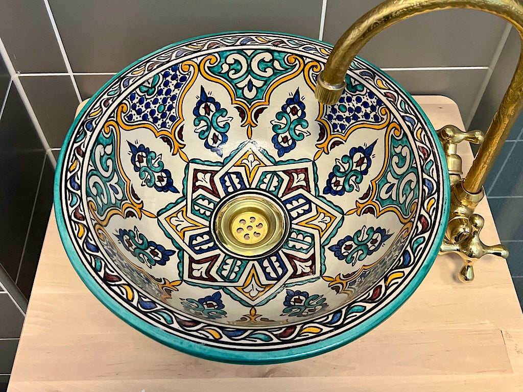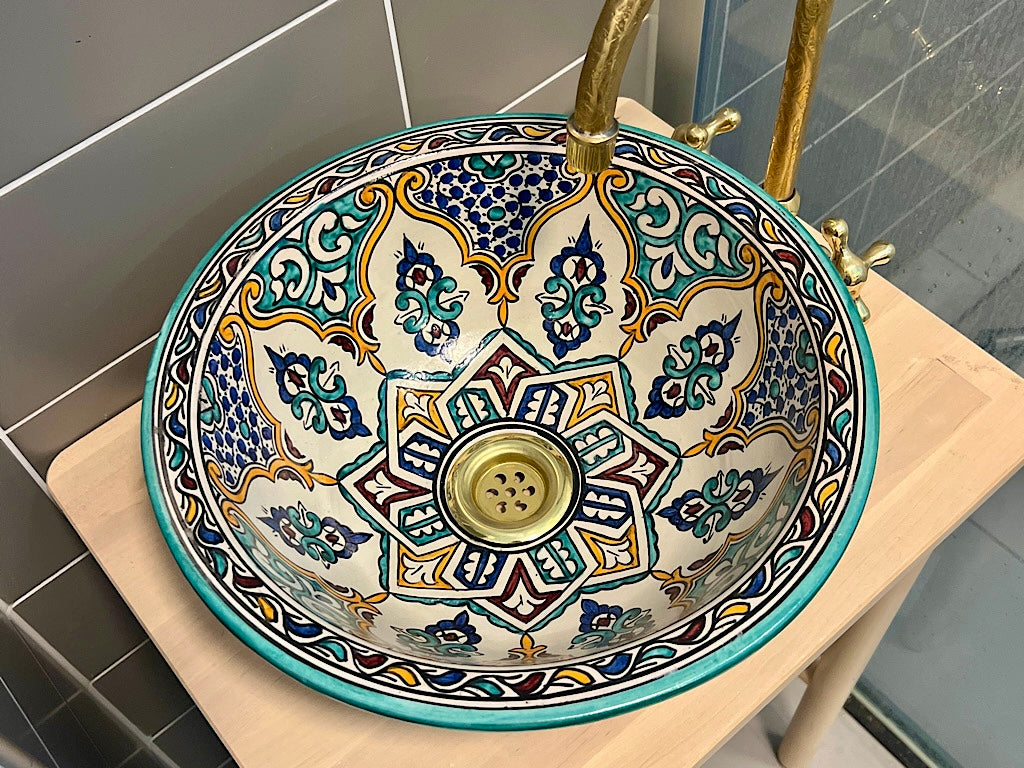 Onze betoverende Marokkaanse wasbak is een prachtige showcase van traditioneel ambachtelijk vakmanschap. Elk stuk wordt met de hand gevormd en zorgvuldig beschilderd door deskundige ambachtslieden uit Marokko, waarbij eeuwenoude technieken worden gebruikt om een opvallend en functioneel kunstwerk te creëren.