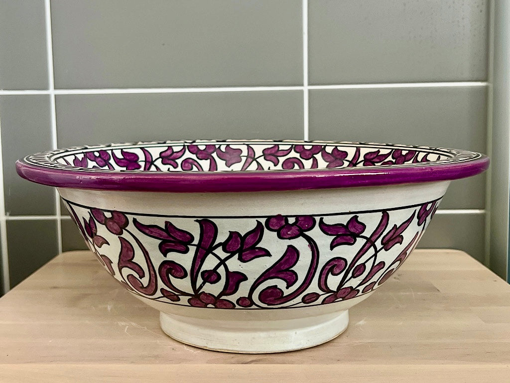 De aardewerken Marokkaanse waskom valt op door zijn prachtige schilderwerk, zowel aan de binnen- als buitenkant. Het detail en de kleurrijke patronen zijn een lust voor het oog en brengen een vleugje exotische Marokkaanse esthetiek in uw badkamer. Ontworpen om op een blad te worden geplaatst, voegt deze waskom een element van luxe en elegantie toe aan uw dagelijkse routine.