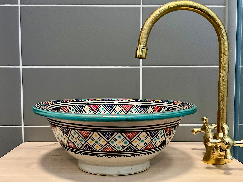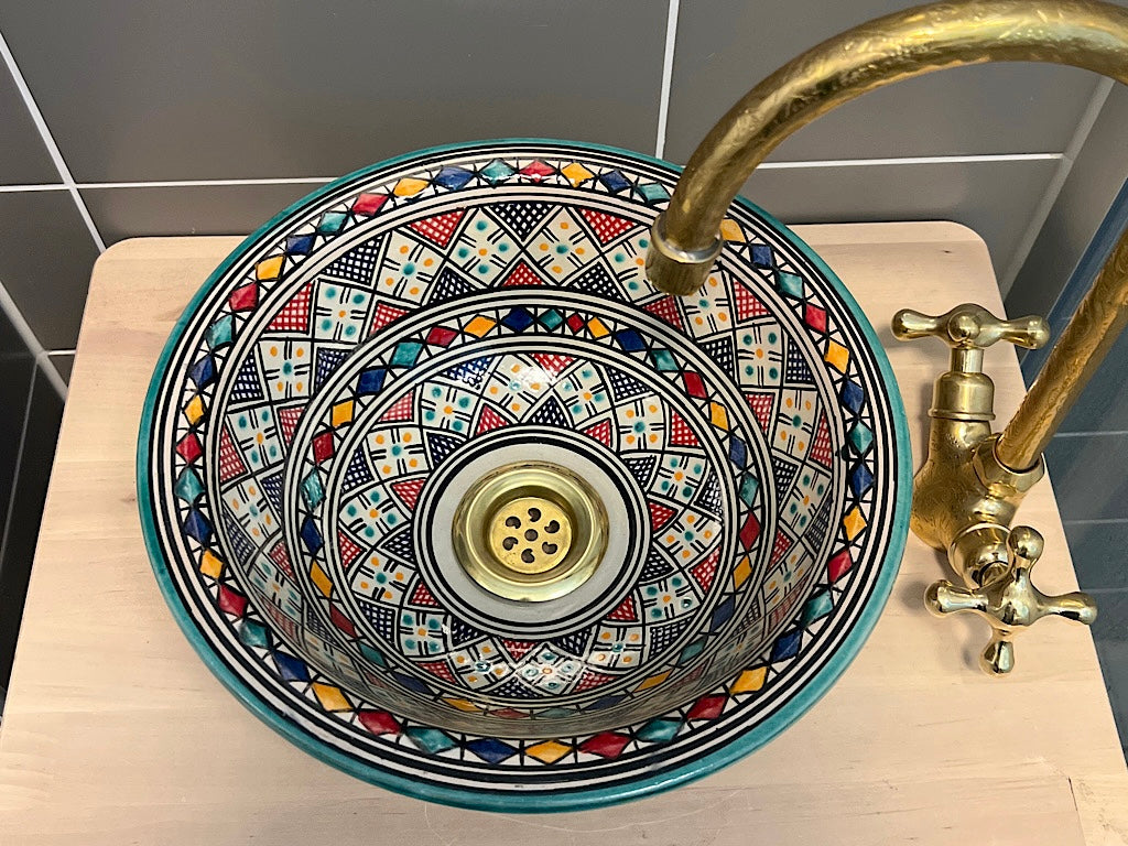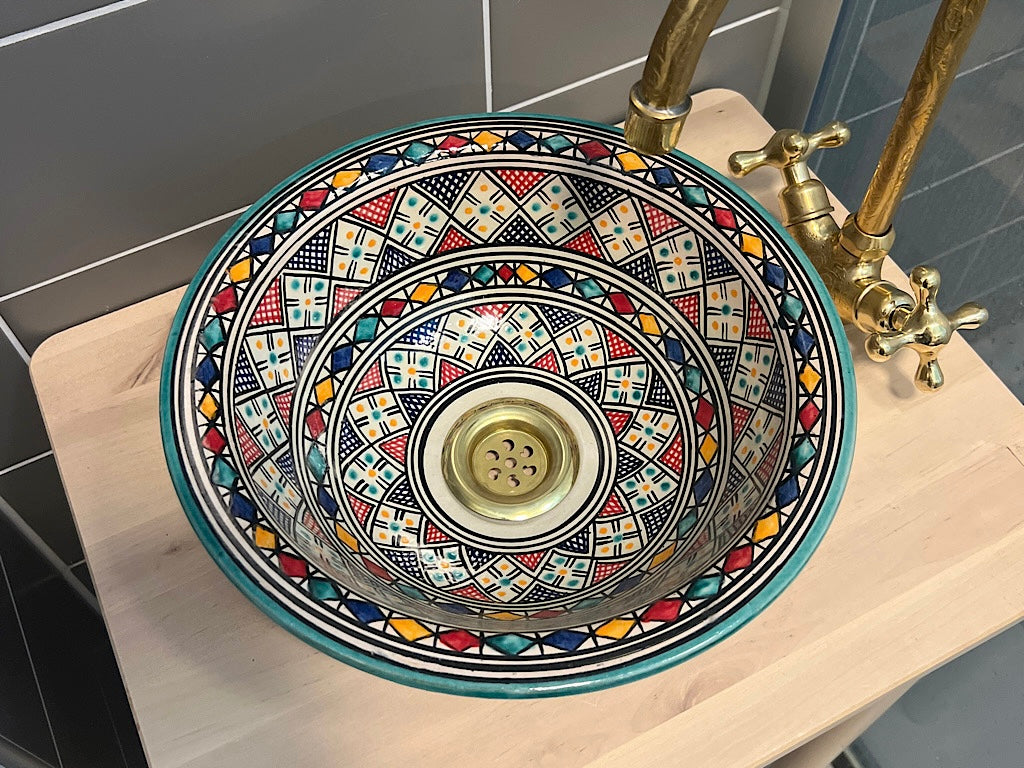 Onze betoverende Marokkaanse wasbak is een prachtige showcase van traditioneel ambachtelijk vakmanschap. Elk stuk wordt met de hand gevormd en zorgvuldig beschilderd door deskundige ambachtslieden uit Marokko, waarbij eeuwenoude technieken worden gebruikt om een opvallend en functioneel kunstwerk te creëren.