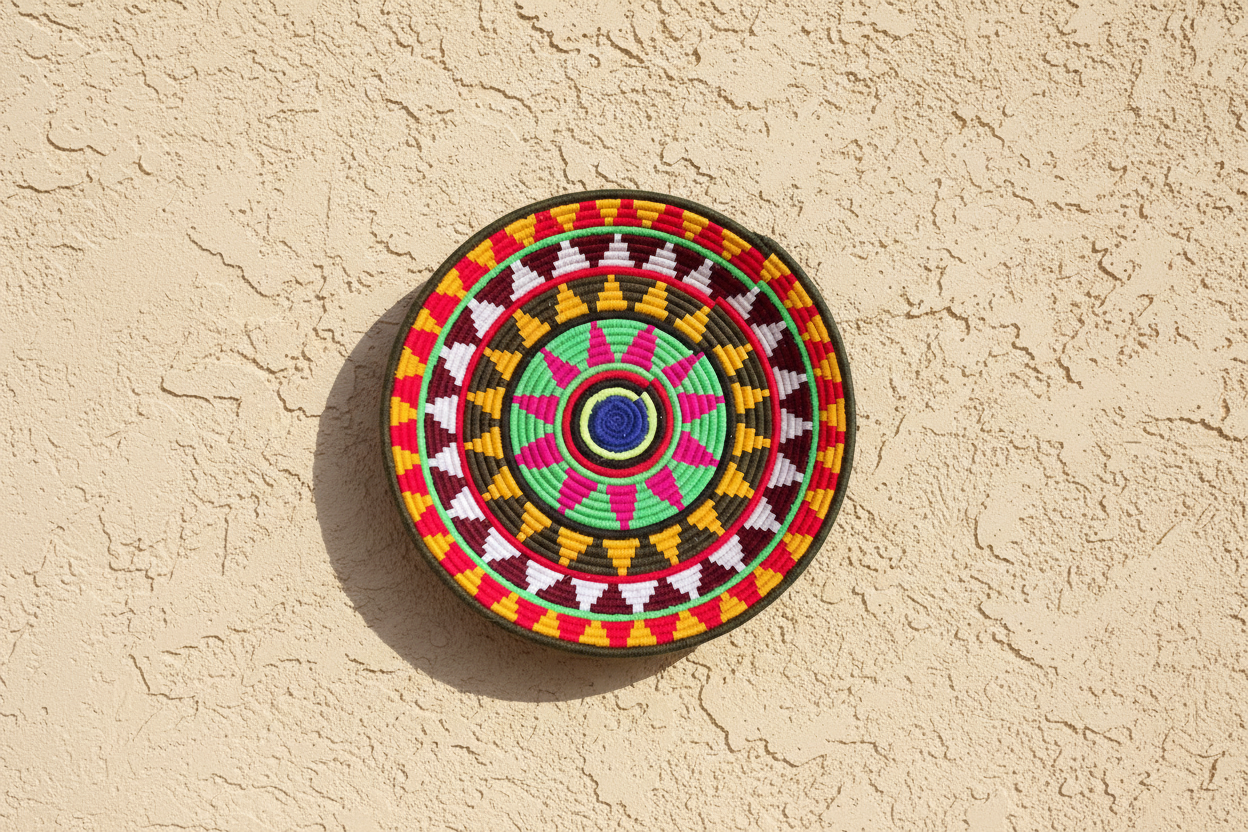 De wandschalen worden volledig met de hand gemaakt in Marokko. Elk stuk krijgt een uniek patroon en kleur, met wol handmatig geweven op de onderzetter. Er is van elke schaal slechts één exemplaar beschikbaar, wat ze uniek maakt.