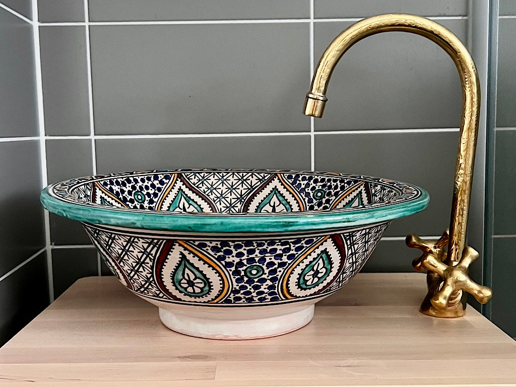 Transformeer je huis in Marokkaanse riad stijl met onze betoverende handgemaakte Marokkaanse waskom, een meesterwerk van traditioneel vakmanschap. Elke Marokkaanse waskom wordt met de hand vervaardigd en zorgvuldig beschilderd door ervaren ambachtslieden uit Marokko, die eeuwenoude technieken gebruiken om een opvallend en functioneel kunstwerk te creëren.