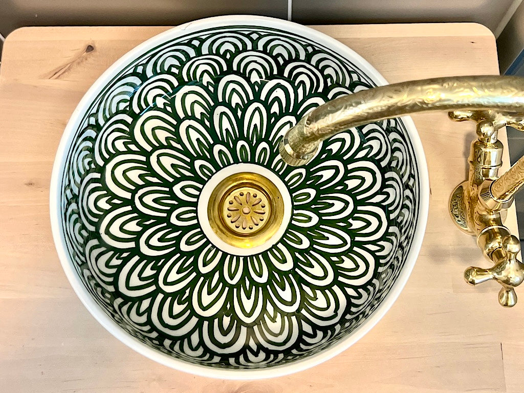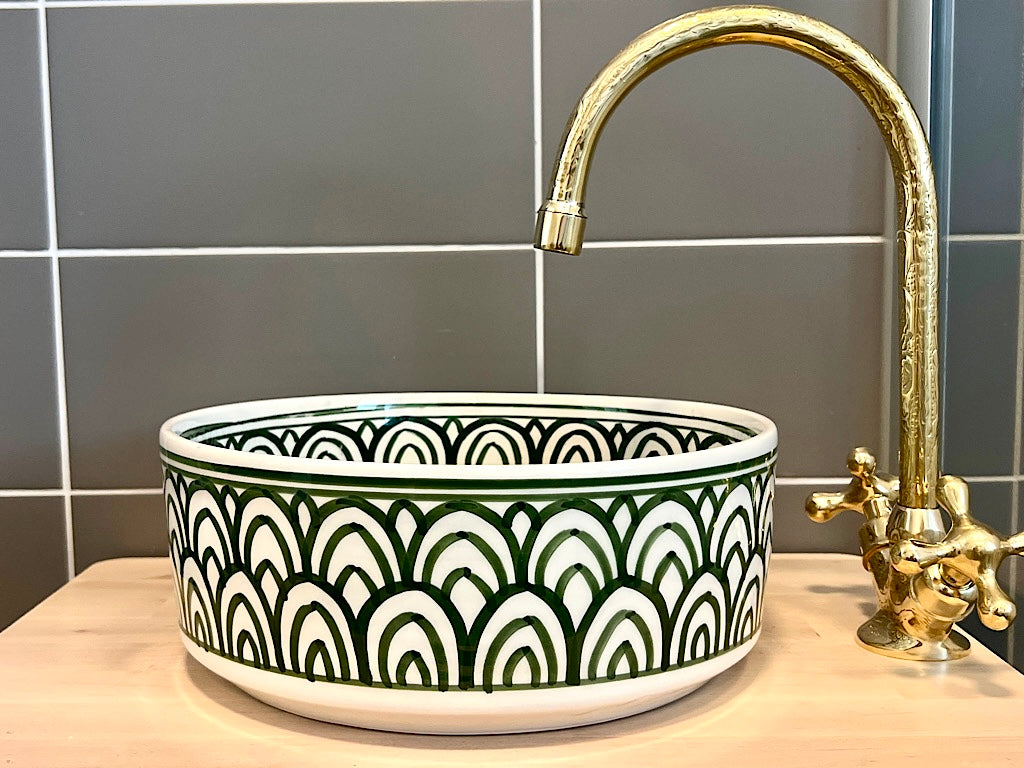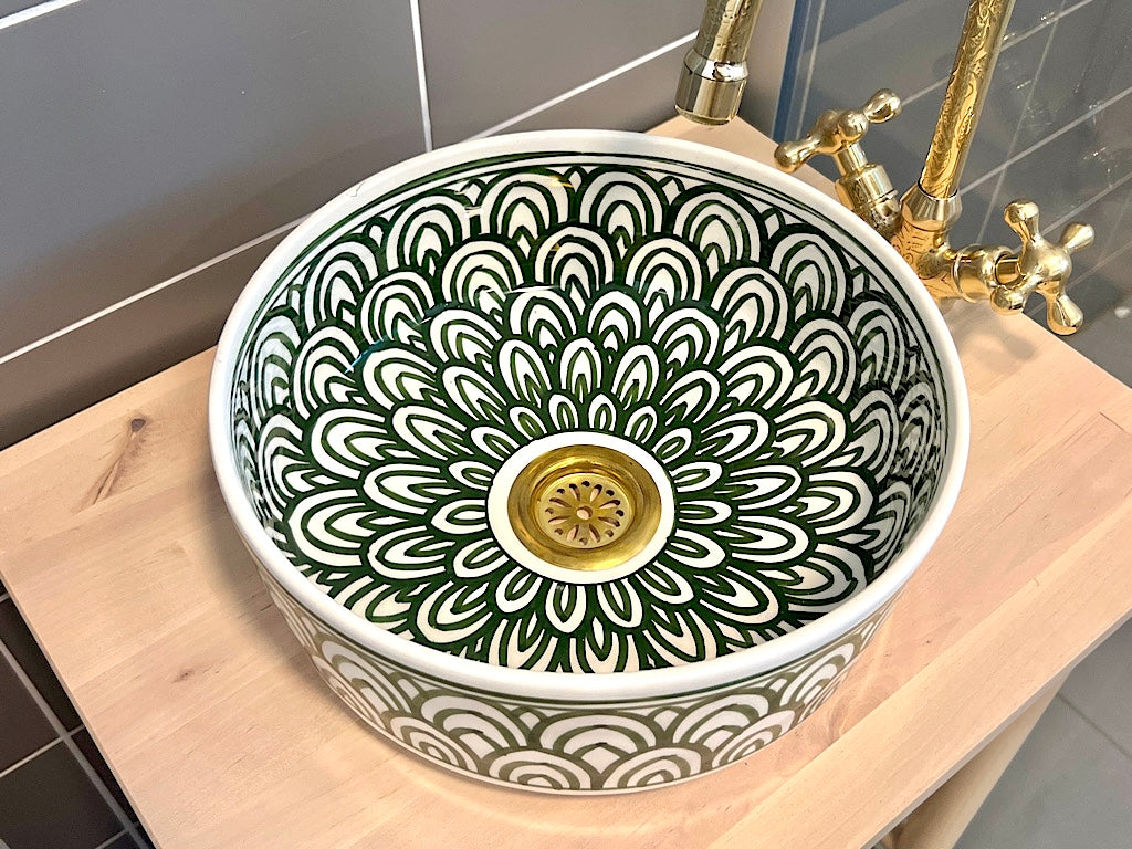 Deze prachtige Marokkaanse wasbak, met de hand vervaardigd en beschilderd door lokale ambachtslieden in Marokko, straalt luxe uit met zijn witte keramische materiaal. De aardewerken Marokkaanse waskom is verfijnd beschilderd aan zowel de binnen- als buitenkant en hoort elegant geplaatst te worden op een blad. Het unieke ambachtelijke proces kan leiden tot kleine onregelmatigheden en imperfecties, die echter niet als gebreken worden beschouwd, maar eerder bijdragen aan de charme en uniciteit van het product.