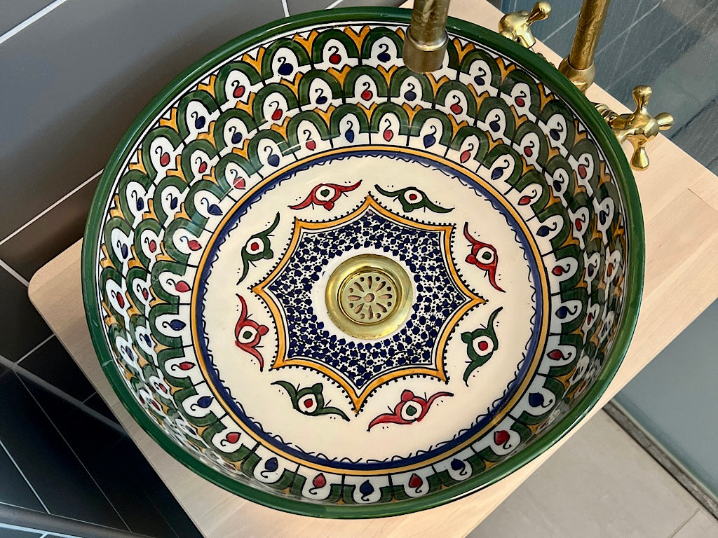 Deze prachtige Marokkaanse wasbak, met de hand vervaardigd en beschilderd door lokale ambachtslieden in Marokko, straalt luxe uit met zijn witte keramische materiaal. De aardewerken Marokkaanse waskom is verfijnd beschilderd aan zowel de binnen- als buitenkant en hoort elegant geplaatst te worden op een blad. Het unieke ambachtelijke proces kan leiden tot kleine onregelmatigheden en imperfecties, die echter niet als gebreken worden beschouwd, maar eerder bijdragen aan de charme en uniciteit van het product.