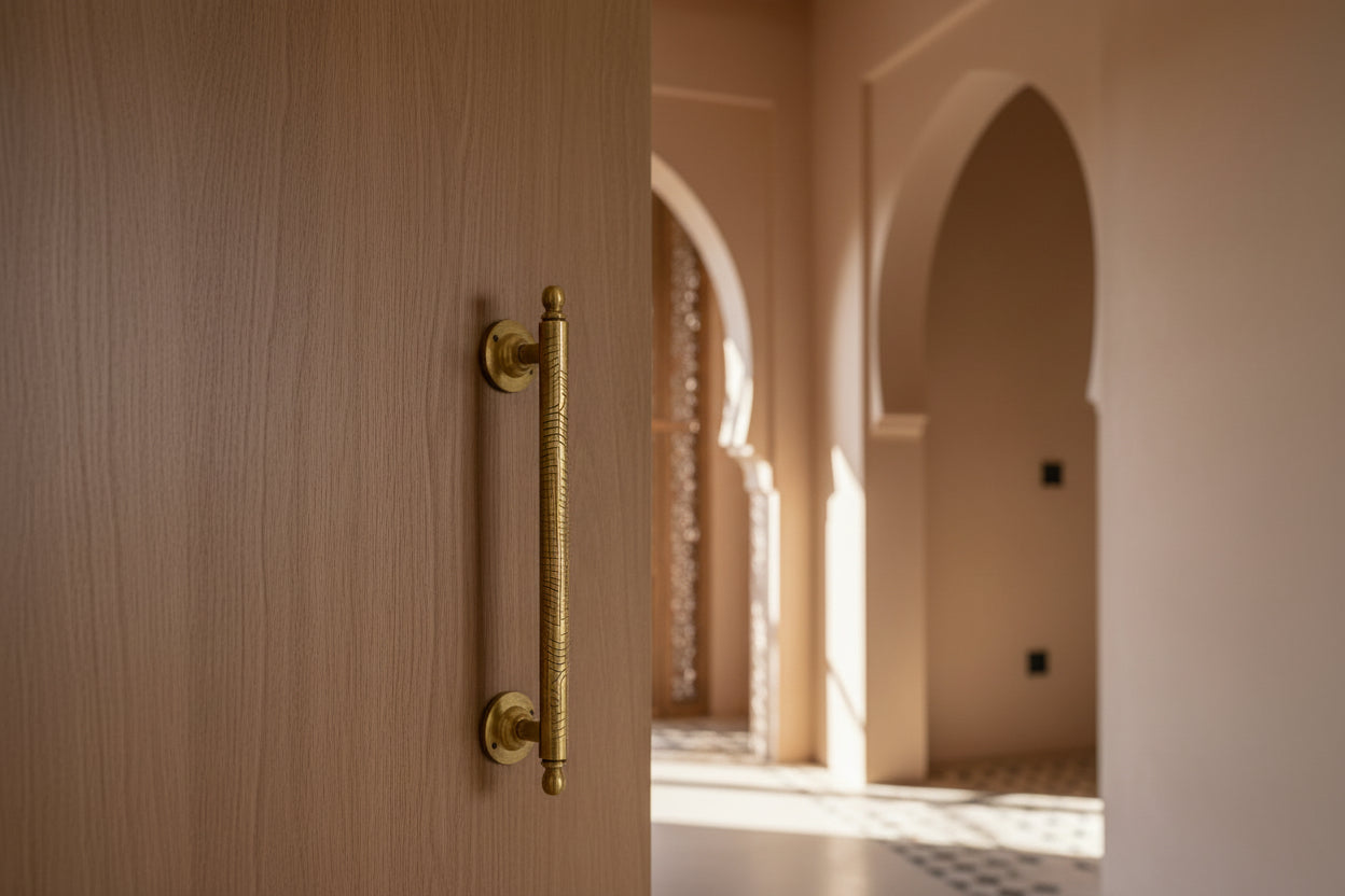 Deze massieve messing deurhendel / kasthendel is een stijlvolle en duurzame keuze voor ieder interieur. De hendel is volledig gemaakt van echt, massief messing en wordt met de hand gegraveerd en handgemaakt in Marokko door ervaren ambachtslieden.