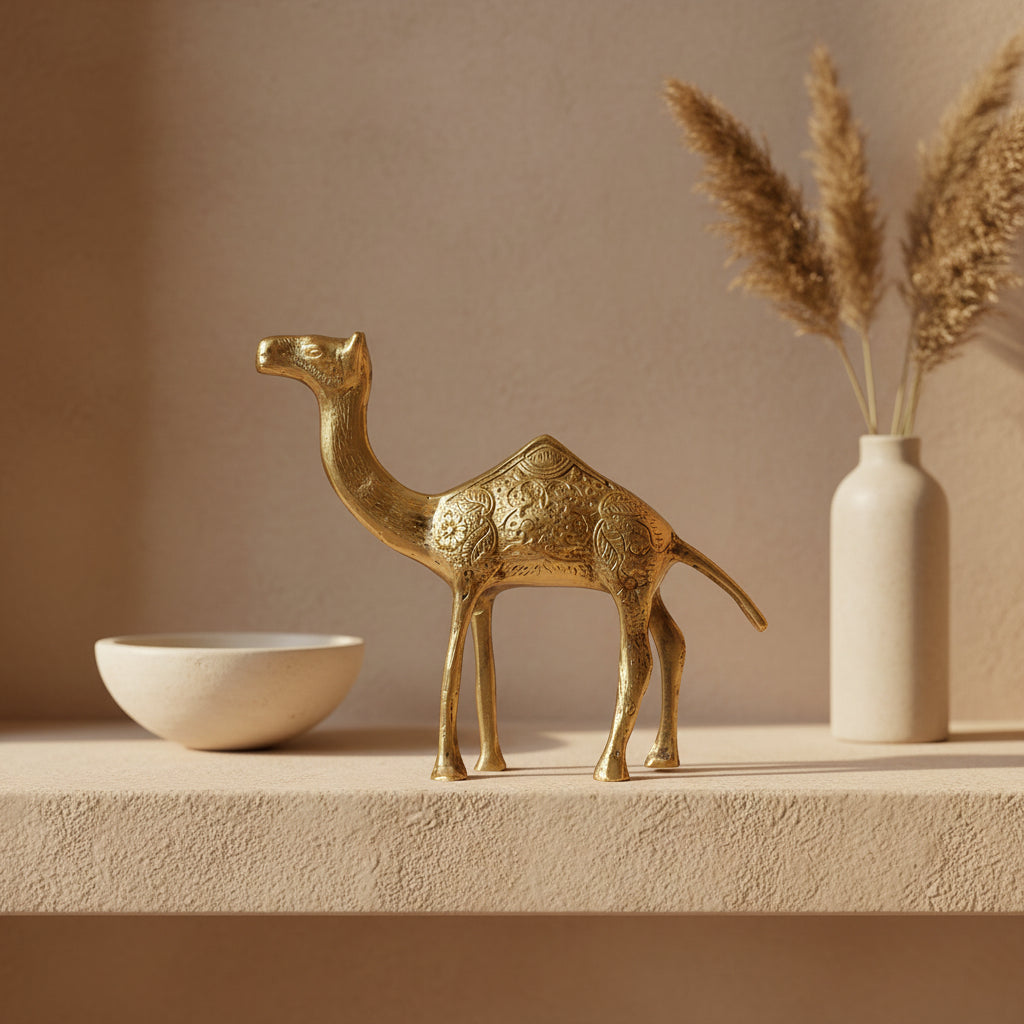 Deze messing dromedaris is een echte blikvanger voor ieder interieur. Het beeld is met de hand gegraveerd door vakmensen in Marokko, waardoor elk exemplaar uniek is en zijn eigen karakter heeft. De fijne details en traditionele patronen laten het ambacht en de rijke Marokkaanse cultuur prachtig tot leven komen.