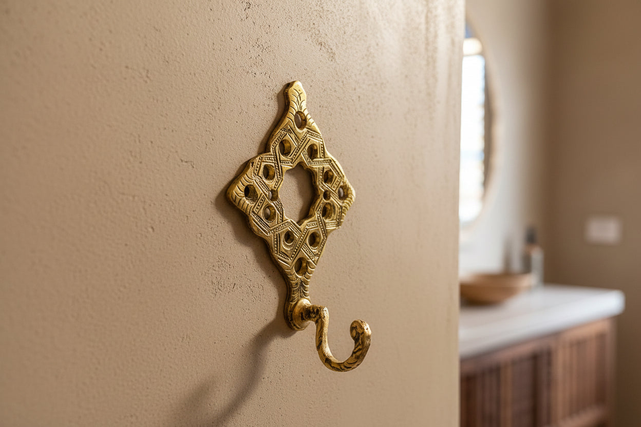 Breng sfeer en functionaliteit samen met deze messing haak. Deze decoratieve wandhaak is met de hand gegraveerd in Marokko en straalt authentiek vakmanschap uit. Elk exemplaar is uniek en vertelt zijn eigen verhaal.