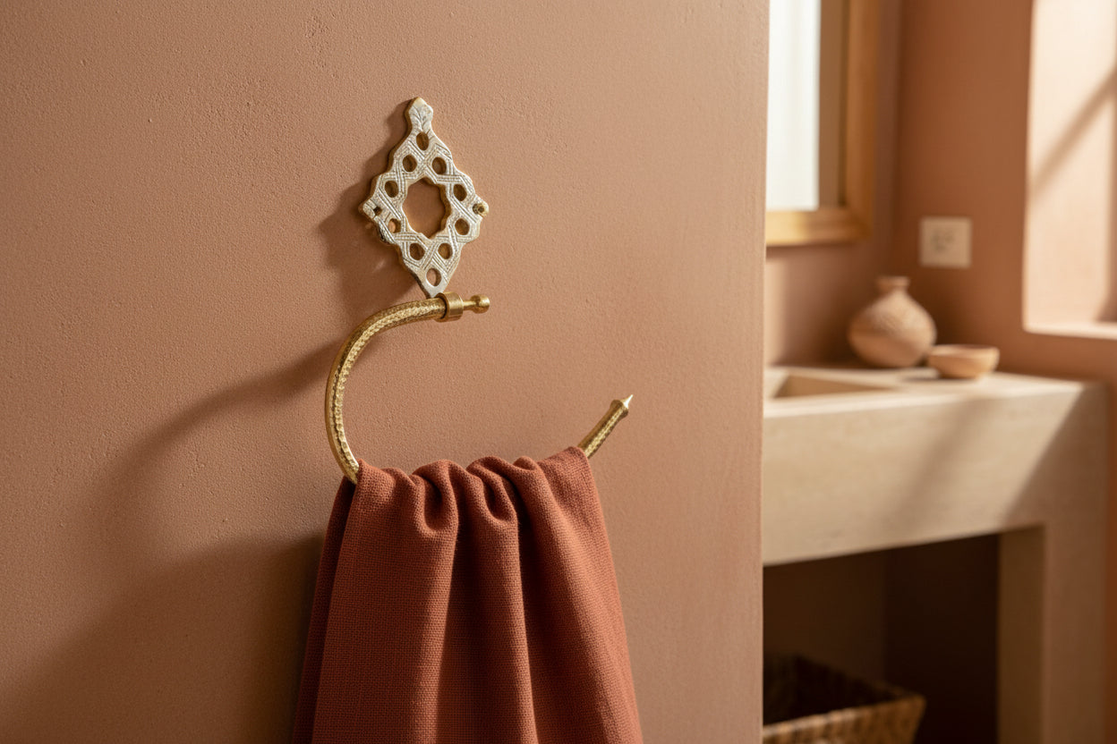 Geef je badkamer een warme, authentieke uitstraling met deze handdoekhaak van massief messing, met de hand gegraveerd in Marokko. Elke handdoekhaak wordt ambachtelijk vervaardigd en is uniek dankzij de verfijnde, traditionele gravures.