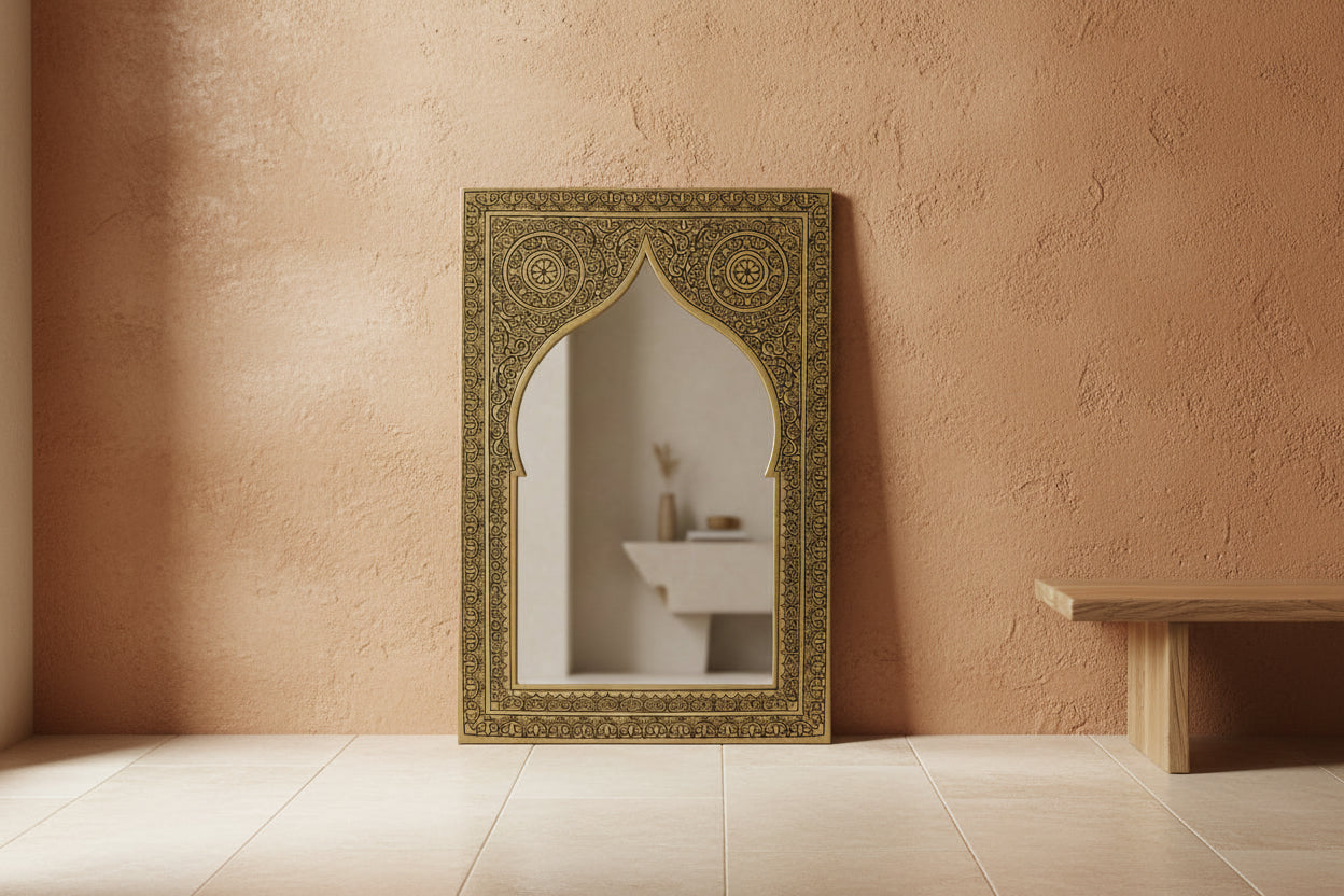 Betreed de wereld van Marokkaanse messing spiegels, waar handgemaakte gravures de rijke Marokkaanse cultuur weerspiegelen. Deze Marokkaanse spiegel is een uniek kunstwerk en combineert traditie, vakmanschap en tijdloze elegantie voor elk interieur.