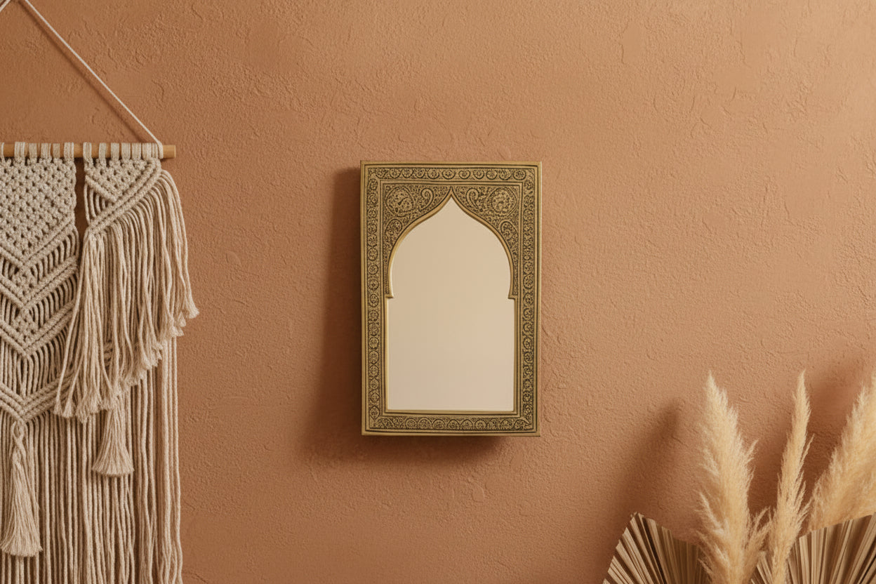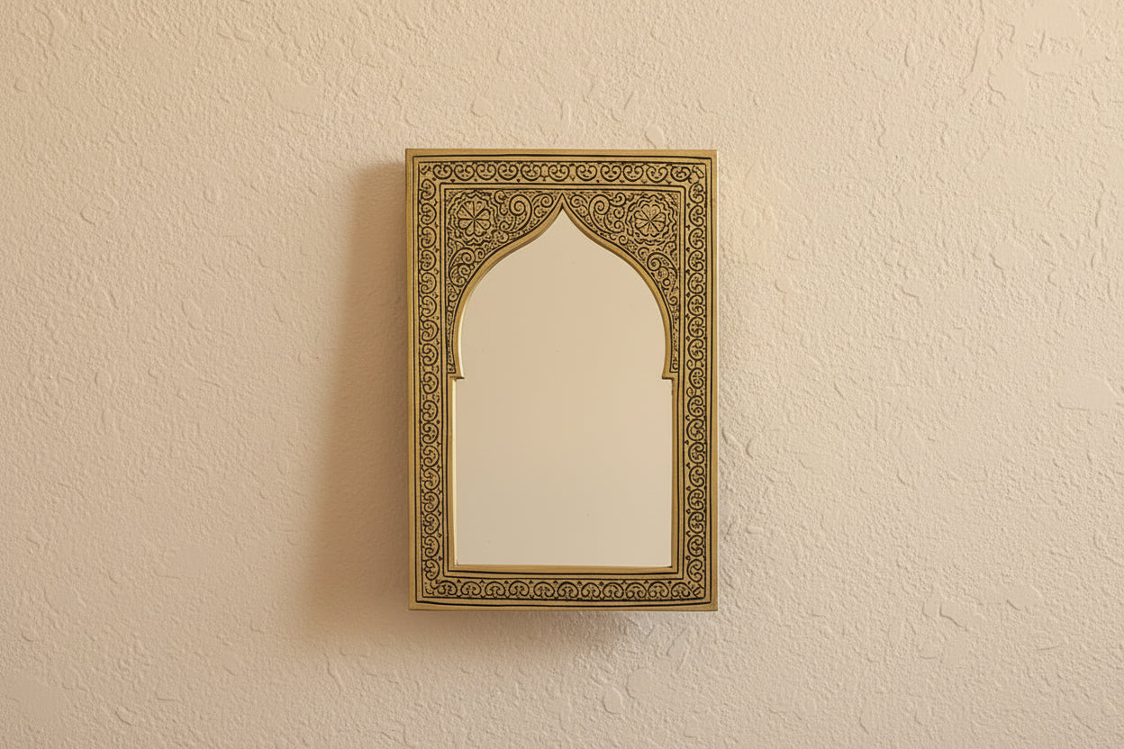 Voeg direct karakter en elegantie toe aan je interieur met een handgemaakte Marokkaanse messing spiegel. Deze Messing Spiegel is voorzien van verfijnde gravures, die de rijke Marokkaanse cultuur weerspiegelen.